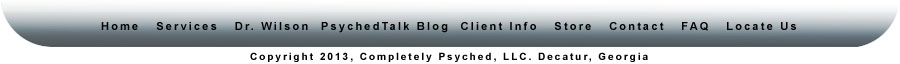 Disclaimer: The information contained in this web site is presented for informational purposes only. The material is in no way intended to replace professional mental health care or the services provided by a qualified mental health professional. Communication with CompletelyPsyched.com does not indicate a therapeutic relationship. You should not use CompletelyPsyched.com as a basis for any self diagnosis or treatment choice. If you have any questions that go beyond the scope of CompletelyPsyched.com you are encouraged to seek assistance from a qualified mental health professional. |